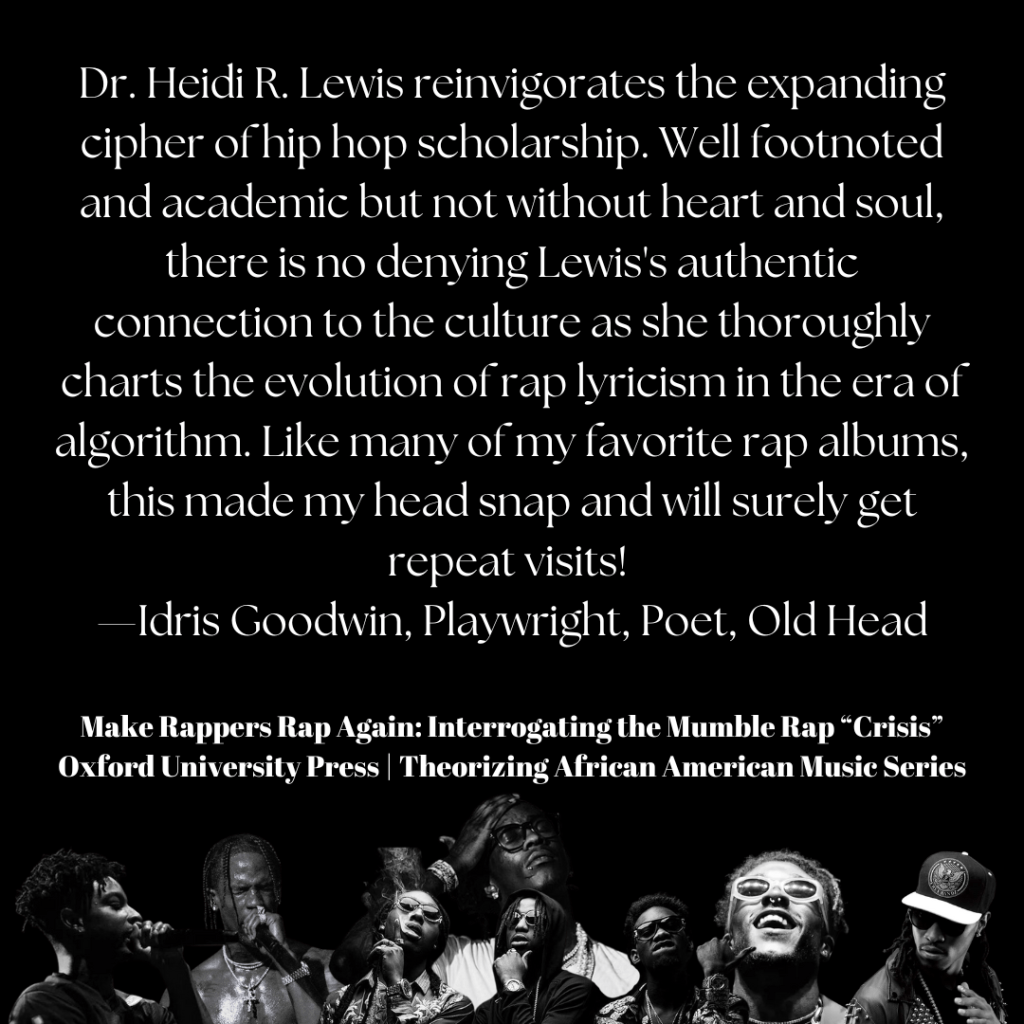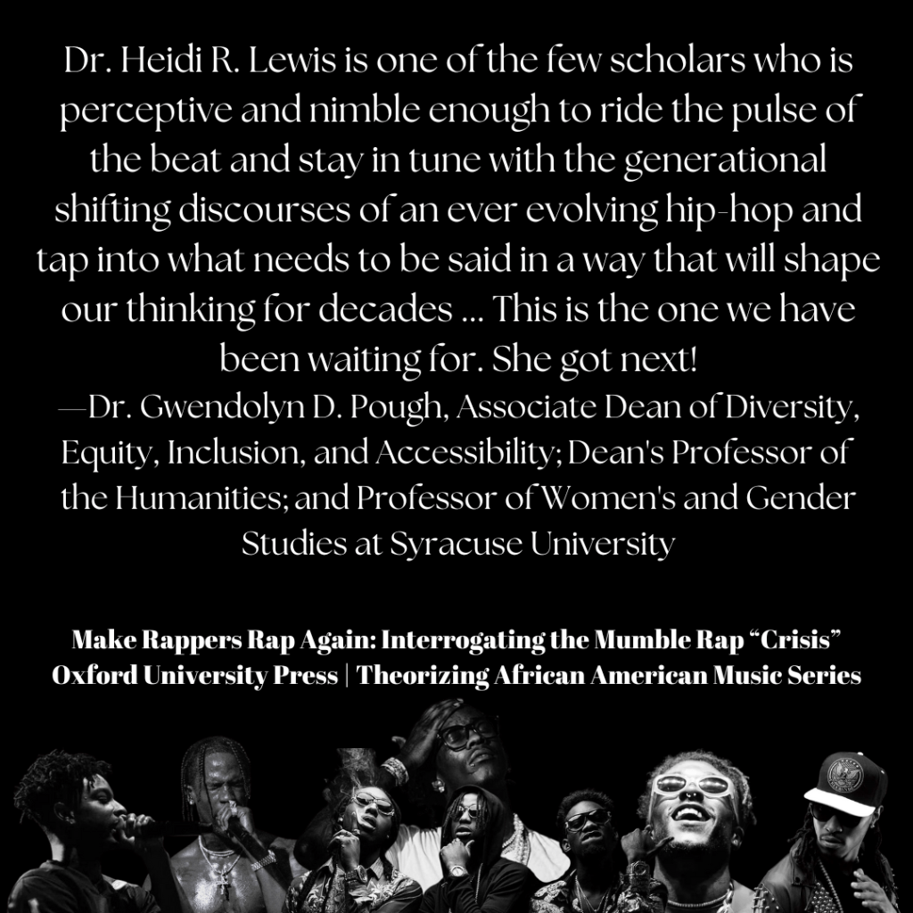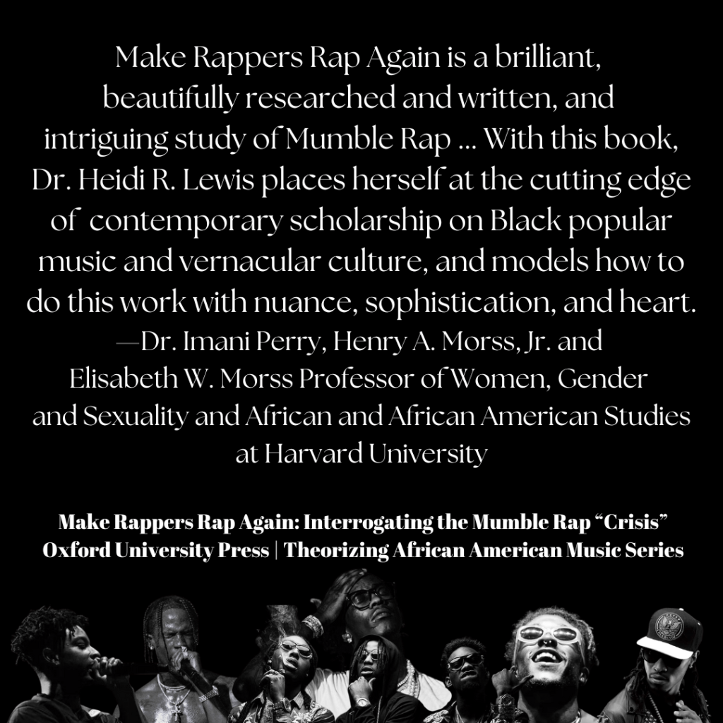 Many critics claim Mumble Rap is not real Hip Hop (or the most authentic or pure), because mumble rappers are ignorant about Hip Hop history, disrespectful toward Hip Hop elders, too similar, unskilled, prone to rapping about nonsense, and too soft or feminine. Some critics have even declared Hip Hop dead (again). In Make Rappers Rap Again: Interrogating the Mumble Rap “Crisis” (Oxford UP, 2025), which features an interview with DJ Drama, I contrarily and perhaps controversially argue Mumble Rap is real Hip Hop. Relying primarily on discourse analysis, I examine Mumble Rap’s congruence with oft-forgotten or subjugated Hip Hop cornerstones like illegibility, melody, the DJ, and the subgenre, as well as the ways most mumble rappers practice citational and collaborative politics congruent with real Hip Hop. I also take a critical approach to examining the Mumble Rap sound, arguing it’s much more complicated than it’s often characterized, especially concerning flow and production. To explain the subjugation of Mumble Rap, I situate the subgenre as Southern and examine the ways it challenges dominant notions about real Hip Hop masculinity vis-à-vis mumble rappers’ attention to the mental and emotional, drug use and addiction, and the fallacies of gender and sexuality norms. Last, but not least, I argue Hip Hop will never die.
